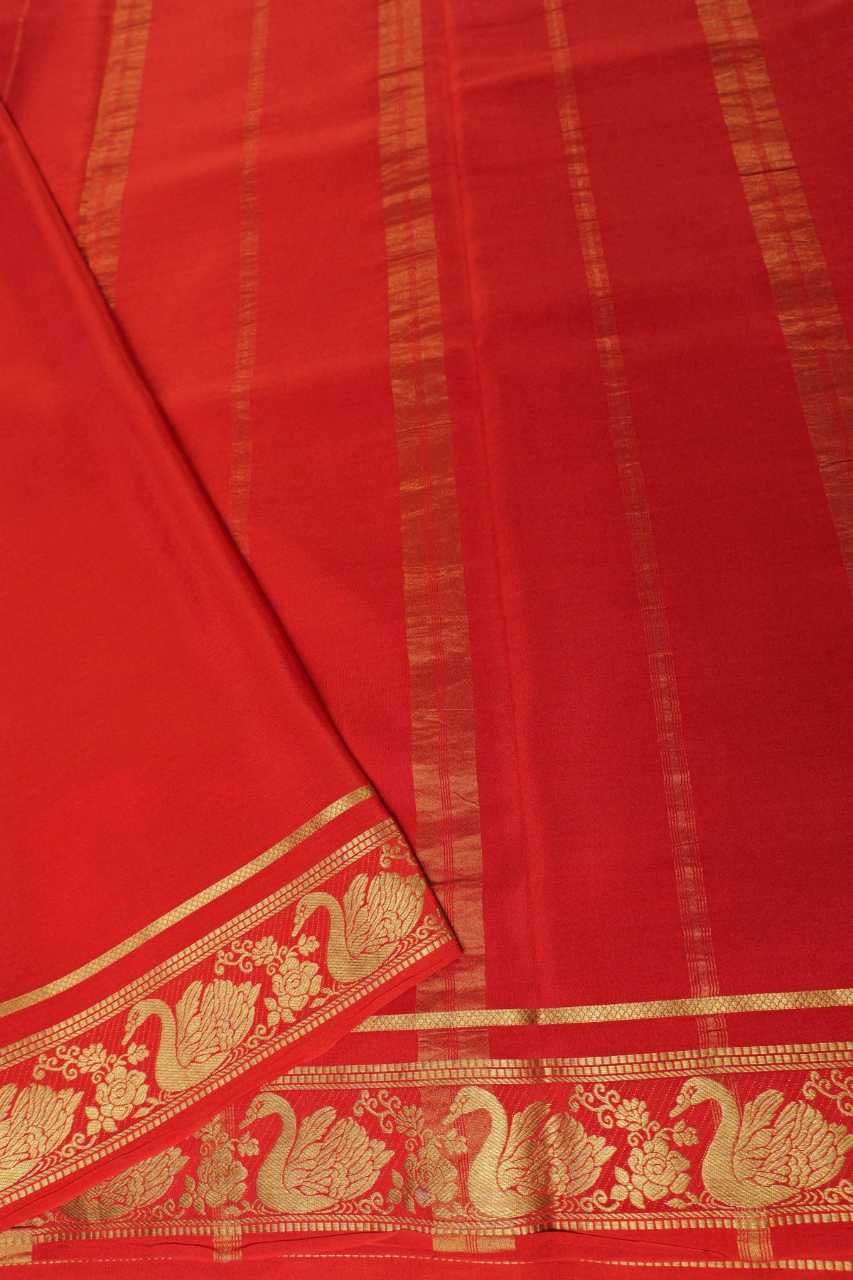 This green and orange pure Mysore silk saree from Atharva showcases a beautiful swan border adorned with gold lace work that exudes artistic elegance. The refreshing green blends wonderfully with energetic orange, creating a lively and balanced colour story. Made from 100% pure Mysore silk with 120 GSM fabric weight, it provides superior softness and radiant sheen. The graceful swan motifs along the border add a touch of refined beauty, making it suitable for festive celebrations, cultural programs, and joyous family occasions. Complete with a contrast blouse piece. Discover pure Mysore silk sarees images with price at Atharva.