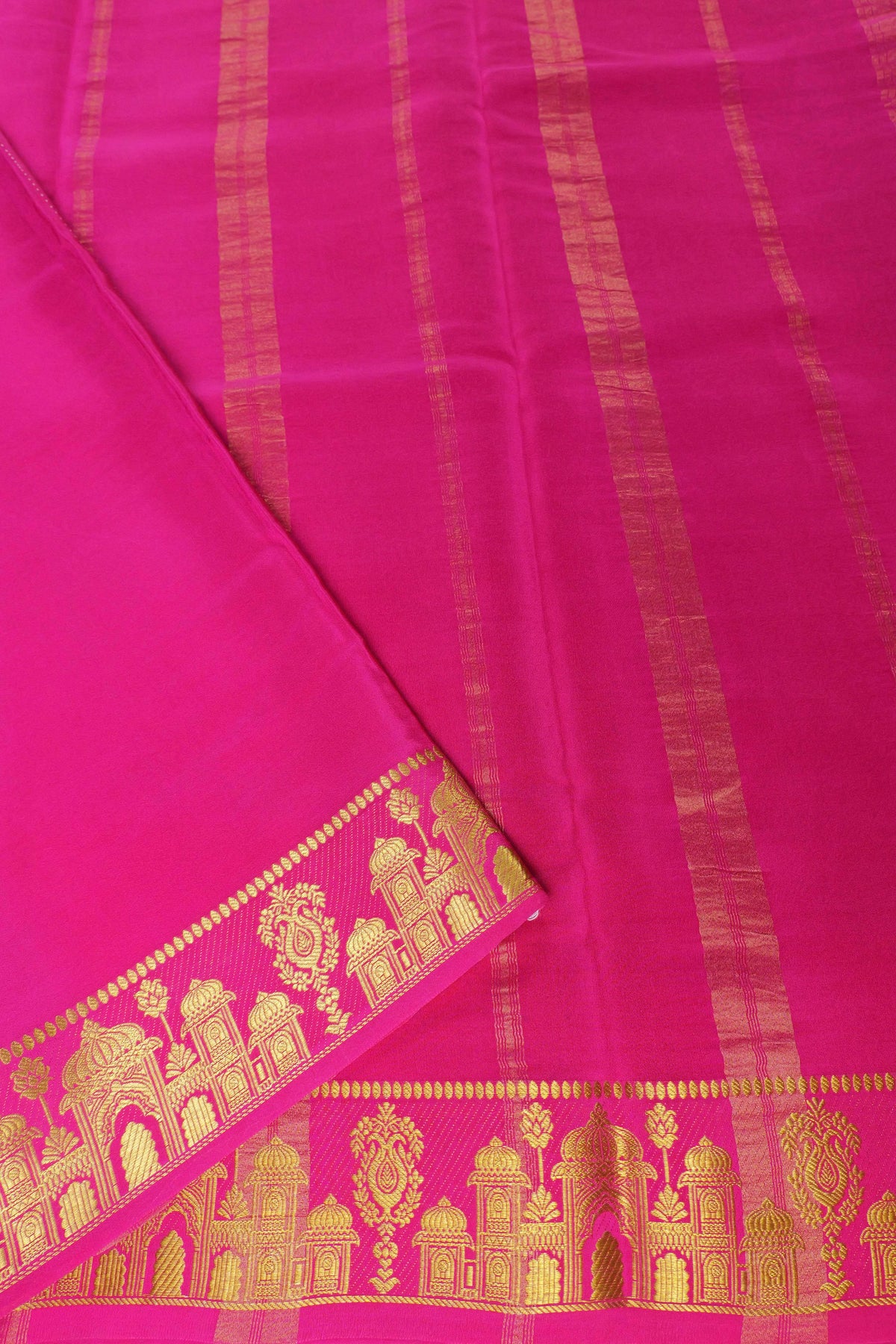 This grey and pink pure Mysore silk saree from Atharva features the classic aramane border beautified with gold lace work that brings timeless elegance. The sophisticated grey paired with delicate pink creates a modern yet traditional aesthetic that's refreshingly different. Made from 100% pure Mysore silk with 120 GSM fabric weight, it ensures premium quality with graceful drape and natural brilliance. The intricate aramane pattern reflects heritage craftsmanship and cultural beauty, making it suitable for formal events, wedding receptions, and elegant gatherings where style speaks volumes. Complete with a contrast blouse piece. Discover Mysore crepe silk sarees with price at Atharva.