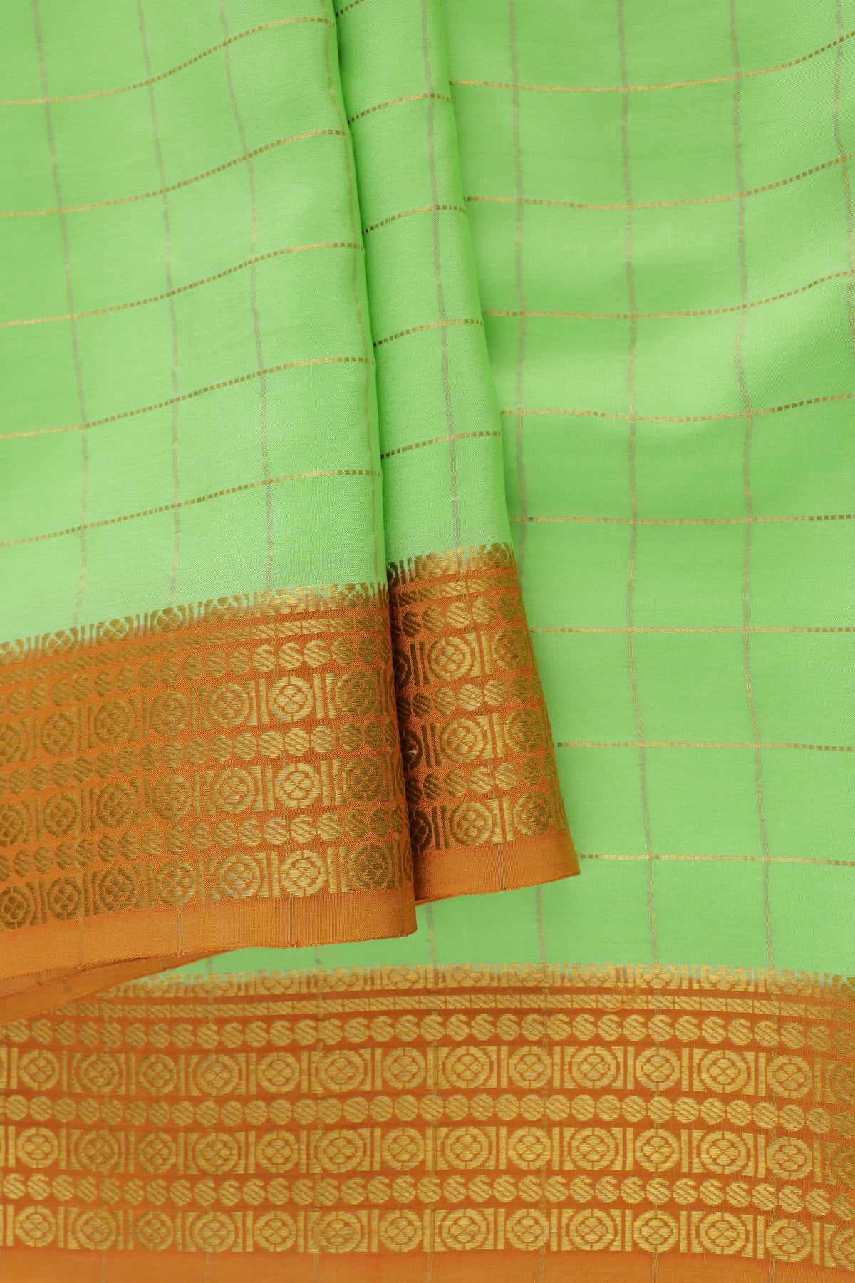 Checks Pattern Pure Gold Lace Mysore Silk Saree In Green and Orange Color With Contrast Orange Blouse