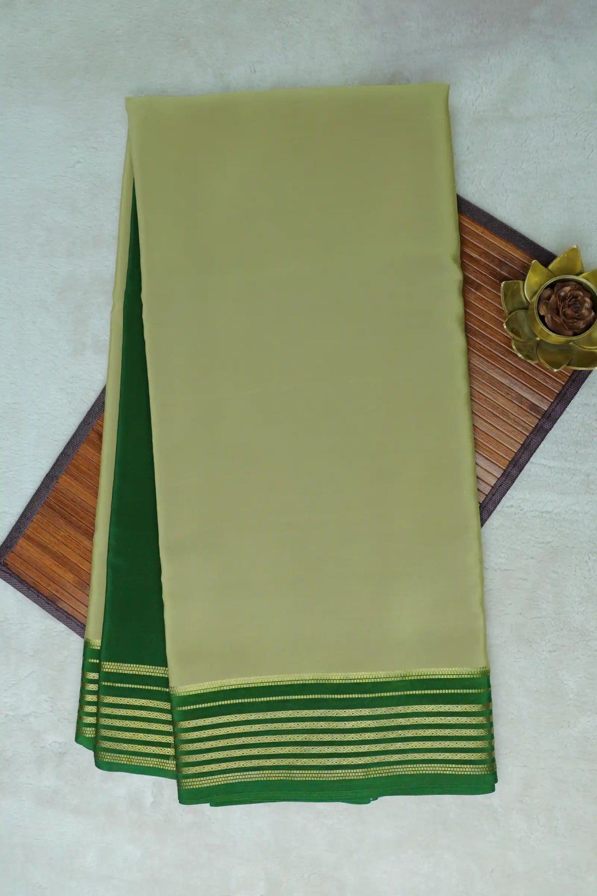 Shop premium Mysore silk sarees at Atharva! This Pure Gold Lace Mysore Silk Saree in beautiful light green and green combination features luxurious gold lace detailing creating an elegant and refreshing appeal. SILK MARK CERTIFIED ensuring authentic quality with premium 120GSM fabric. The soothing light green body paired with vibrant green accents and shimmering gold lace creates a graceful look perfect for weddings and festive celebrations. Includes a contrast green blouse piece. Explore Mysore crepe silk sarees collection at Atharva!