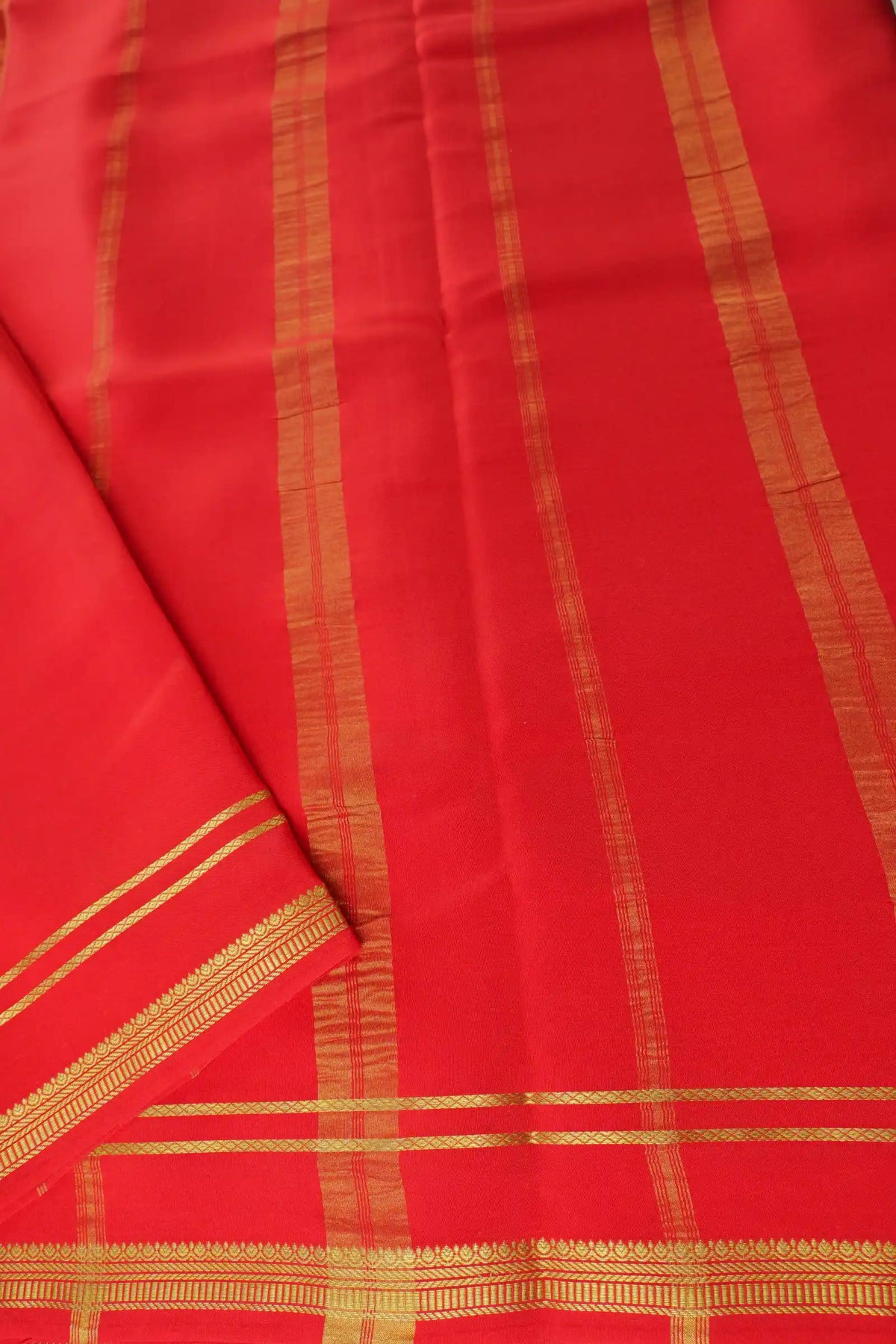 Shop at the Best Online Mysore silk Sarees Shopping Site - Atharva! This 2 Line Bentex Gold Lace Border Pure Mysore Silk Saree in stunning red features elegant 2-line Bentex pattern beautifully adorned with luxurious gold lace detailing along the border. SILK MARK CERTIFIED ensuring authentic quality with premium 120GSM fabric. The vibrant red shade with shimmering gold lace creates a bold and elegant look perfect for weddings and festive occasions. Includes a self-red blouse piece. Explore Mysore crepe silk sarees online at Atharva!