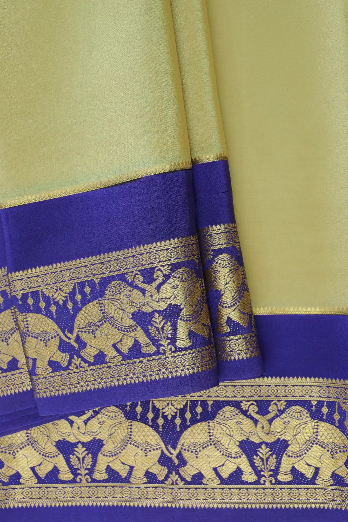 Elephant Border Pure Mysore Silk Saree in Gold and Blue Color with Contrast Blue Color Blouse