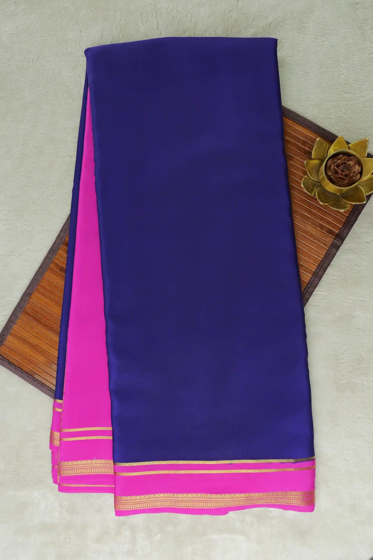 Shop authentic Mysore silk sarees at Atharva! This 2 Line Bentex Gold Lace Border Pure Mysore Silk Saree in beautiful blue and pink combination features elegant 2-line Bentex pattern adorned with luxurious gold lace detailing. SILK MARK CERTIFIED ensuring genuine quality with premium 120GSM fabric. The captivating blue body paired with charming pink border creates a graceful and sophisticated look perfect for weddings and celebrations. Includes a contrast pink blouse piece. Visit our Mysore silk sarees showroom at Atharva!
