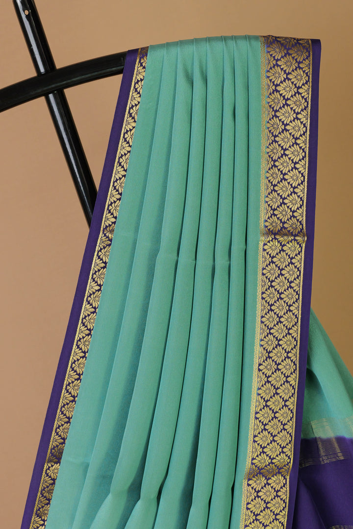The soothing canel blue body is elegantly contrasted by deep navy blue borders, enriched with gold lace and intricate zari detailing that reflect true craftsmanship. Whether worn at a wedding, temple ceremony, or festival, this saree brings a sense of regal grace to every moment.